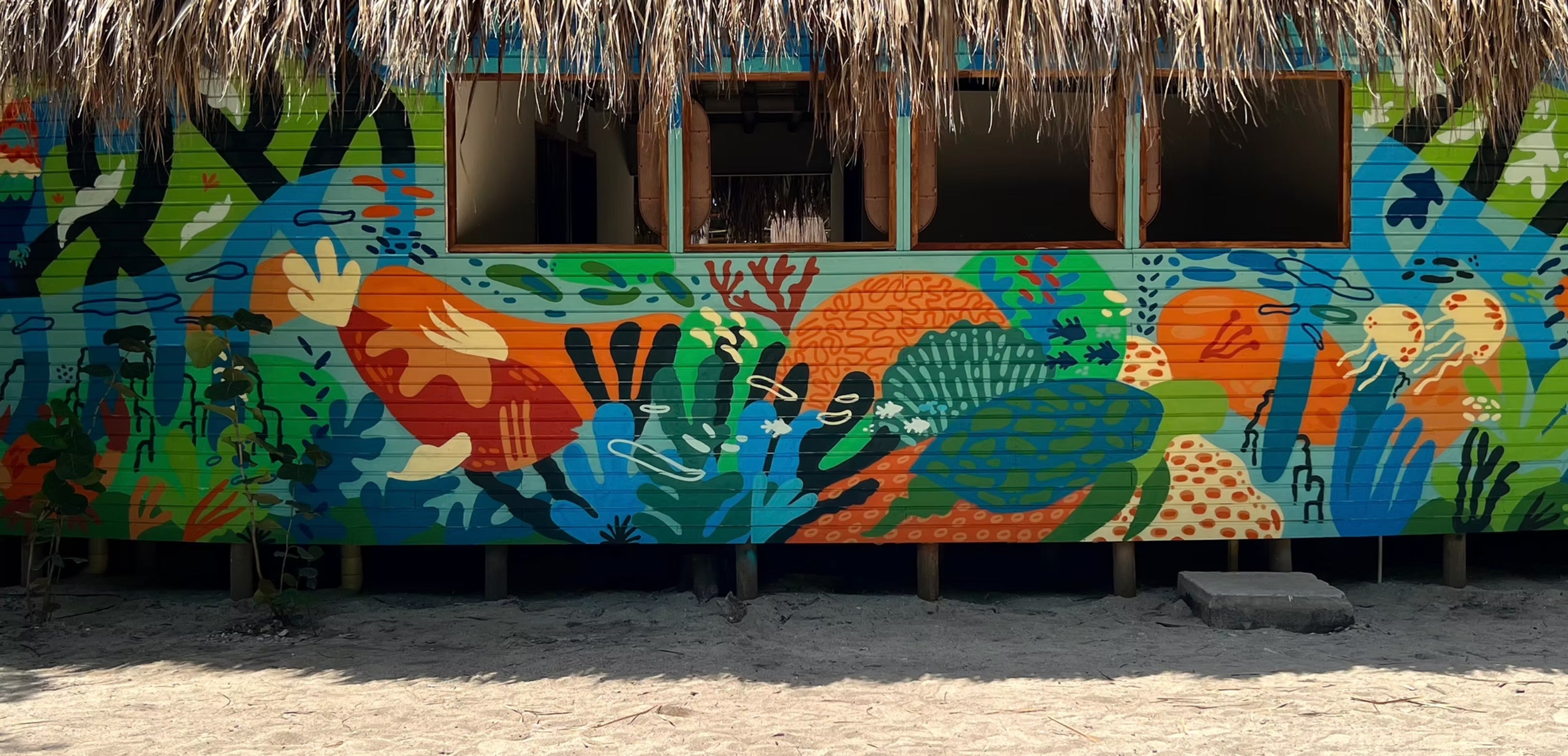 Concepto: Este mural está inspirado en la importancia vital de los manglares como hábitat esencial para diversas especies. Los manglares son el hogar de las etapas iniciales de vida de muchos peces y otras criaturas, desempeñando un papel crucial en sus ciclos de vida. Los animales representados en este muro son especies que habitan y dependen de estos ecosistemas únicos.