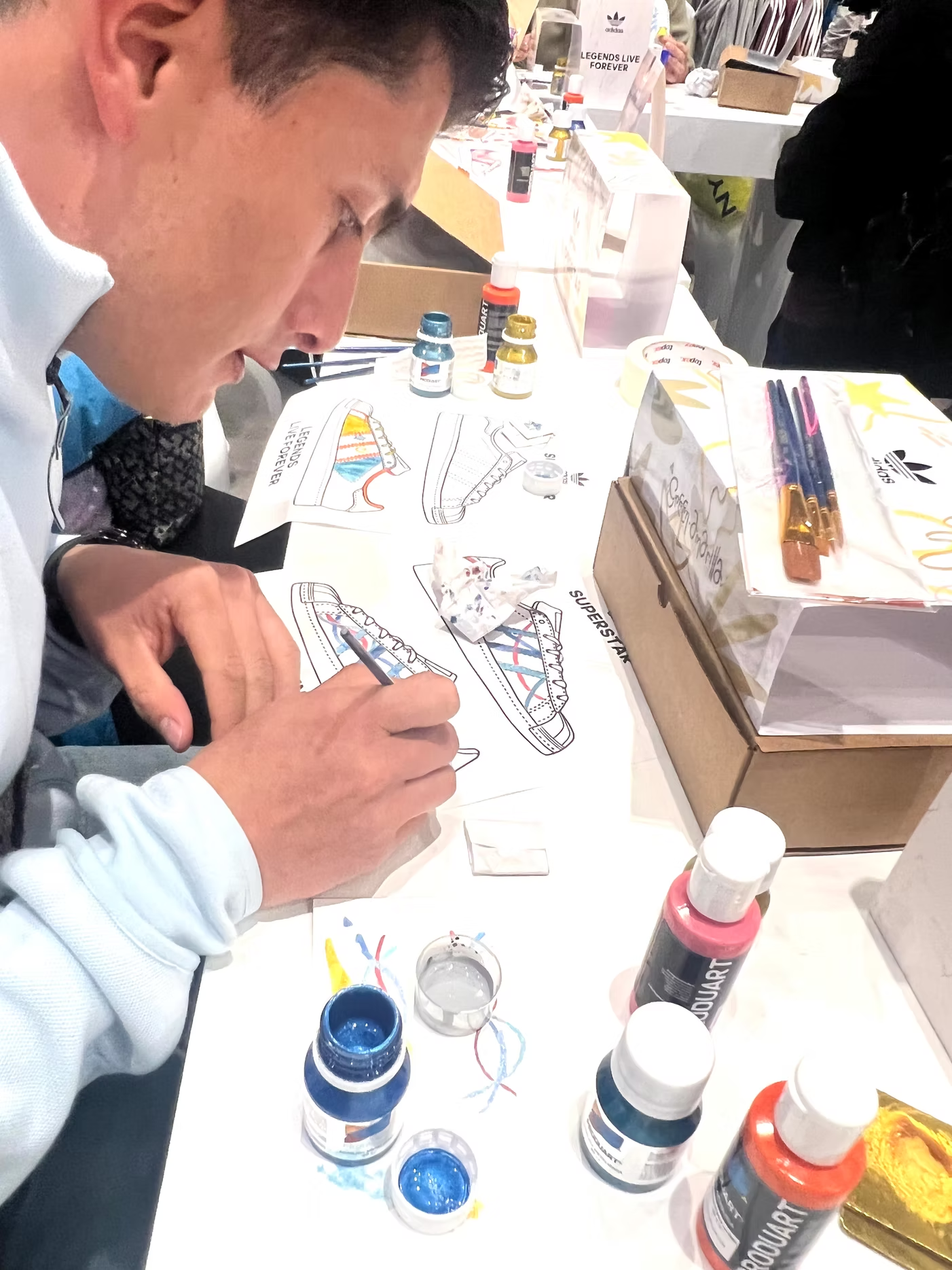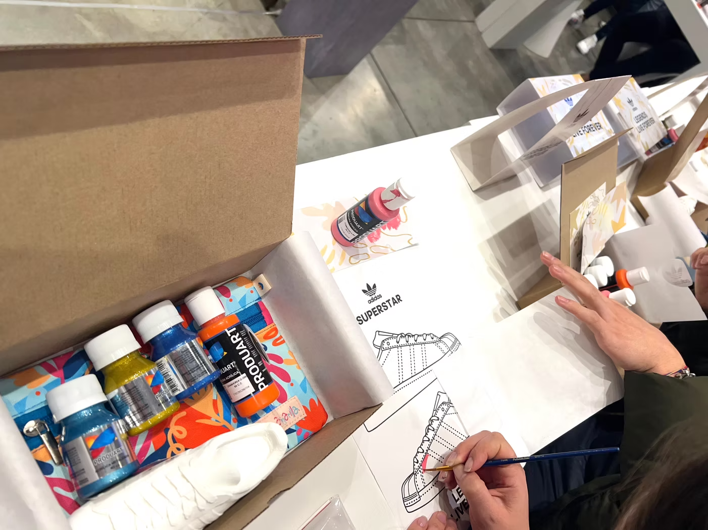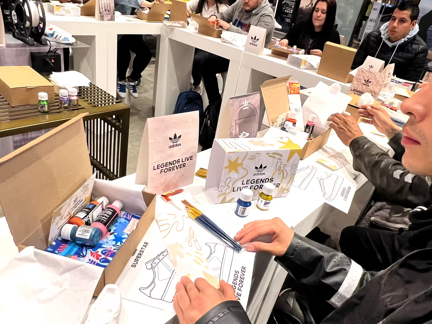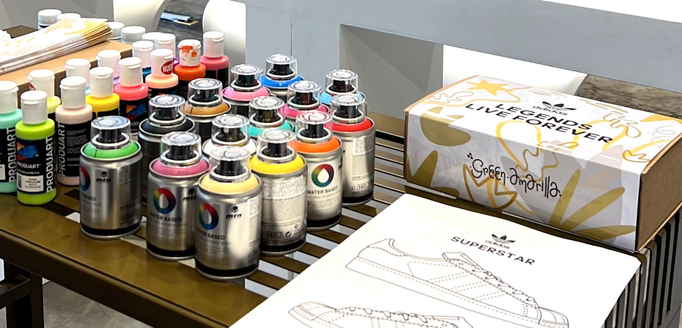 Misión: Organizar un taller exclusivo para los miembros de adiClub, donde pudieran vivir una experiencia única. La actividad consistía en personalizar la silueta Superstar, impresa en 3D. Los participantes recibieron una caja que contenía los tenis, pinturas, plantillas para aerosoles y una cartuchera Green Amarilla.